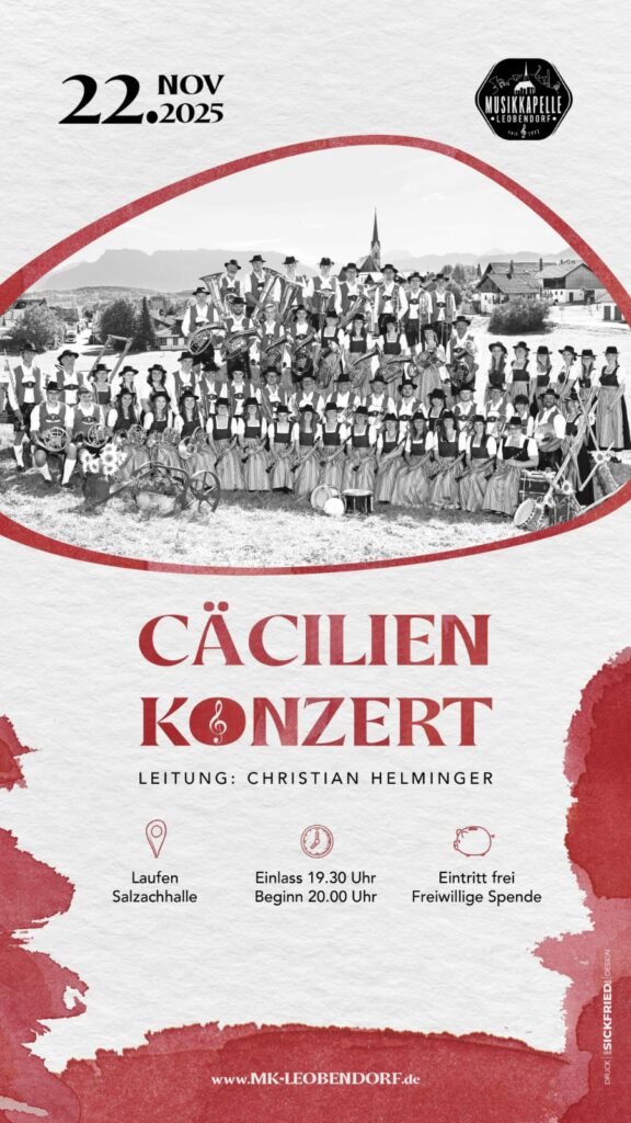 Zückt euren Kalender und Stift – ein wichtiger Termin steht an! Am 22. November spielt die Musikkapelle Leobendorf wieder das Cäcilienkonzert in der Salzachhalle in Laufen. Die Konzertproben sind bereits in vollem Gange und das Programm steht – wir freuen uns auf viele musikbegeisterte Besucher!